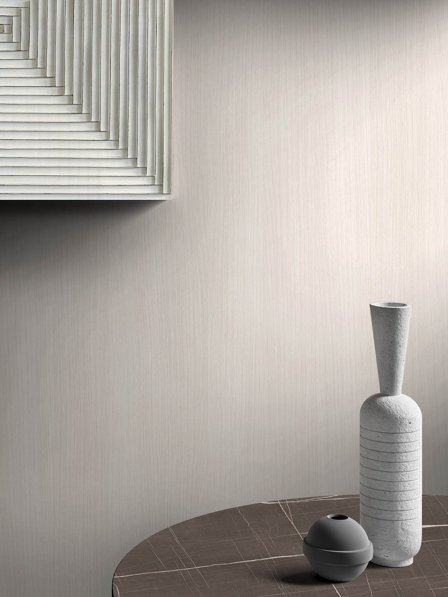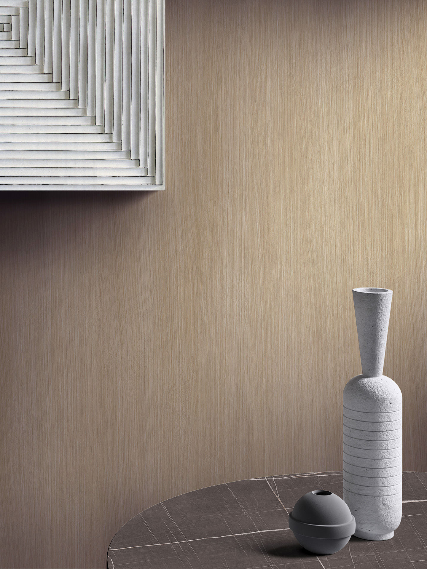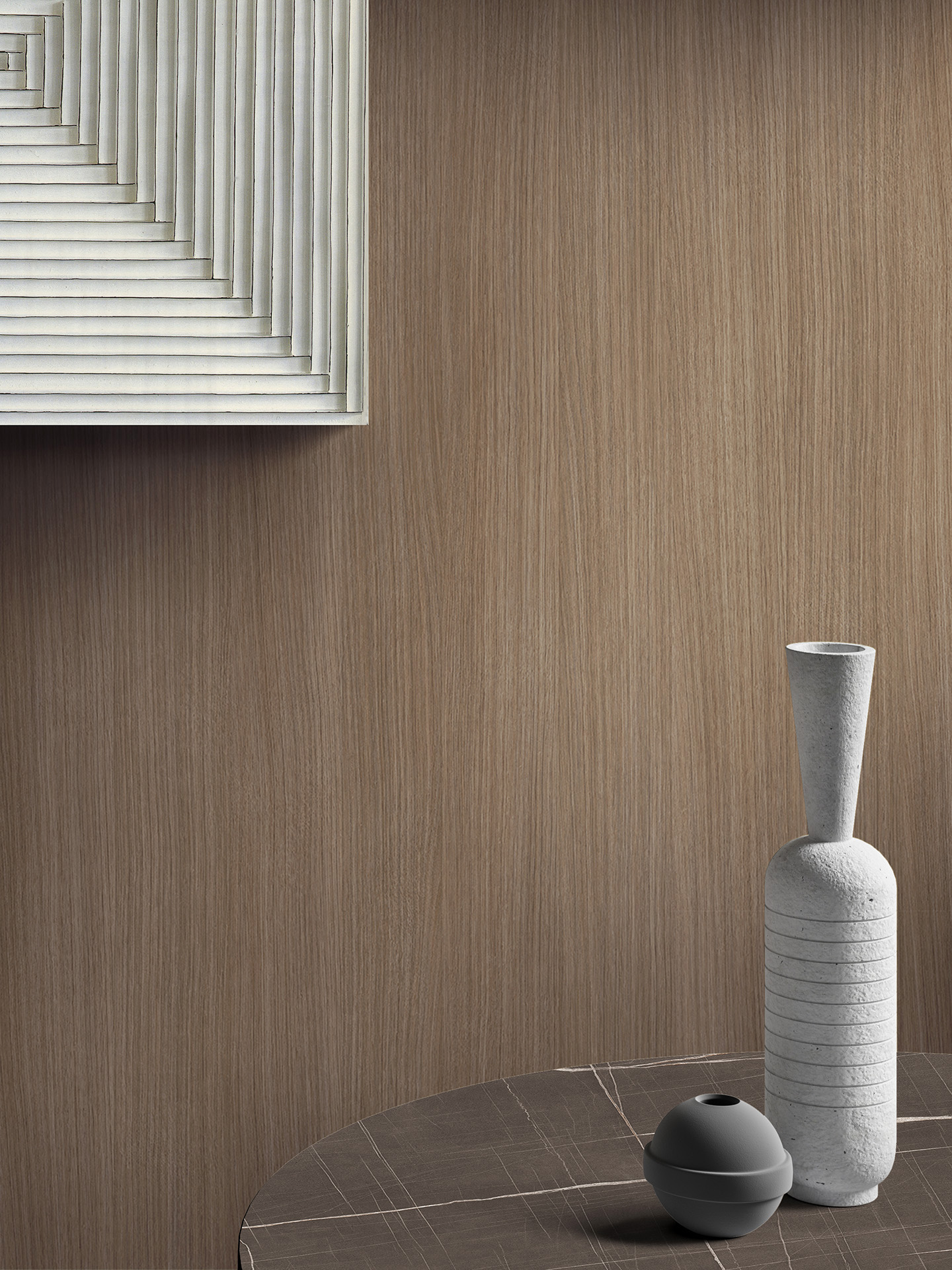 La semplicità e linearità di un rovere rigato che sorprende per livello di dettaglio e definizione. La tavolatura appena accennata è impreziosita da giochi di luce e passaggi cromatici.