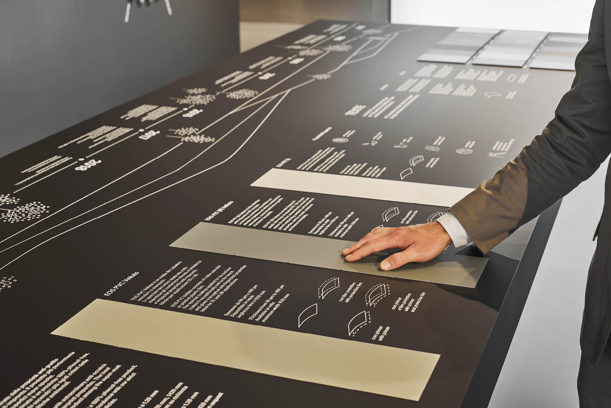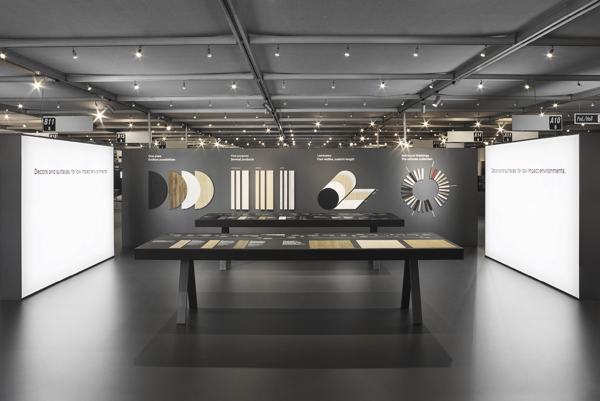 A dedicated illustration for each of these elements can be found on the back wall, while at the heart of the exhibition space, two large tables provide a detailed description of the product families and the Group’s commitment to sustainability.
