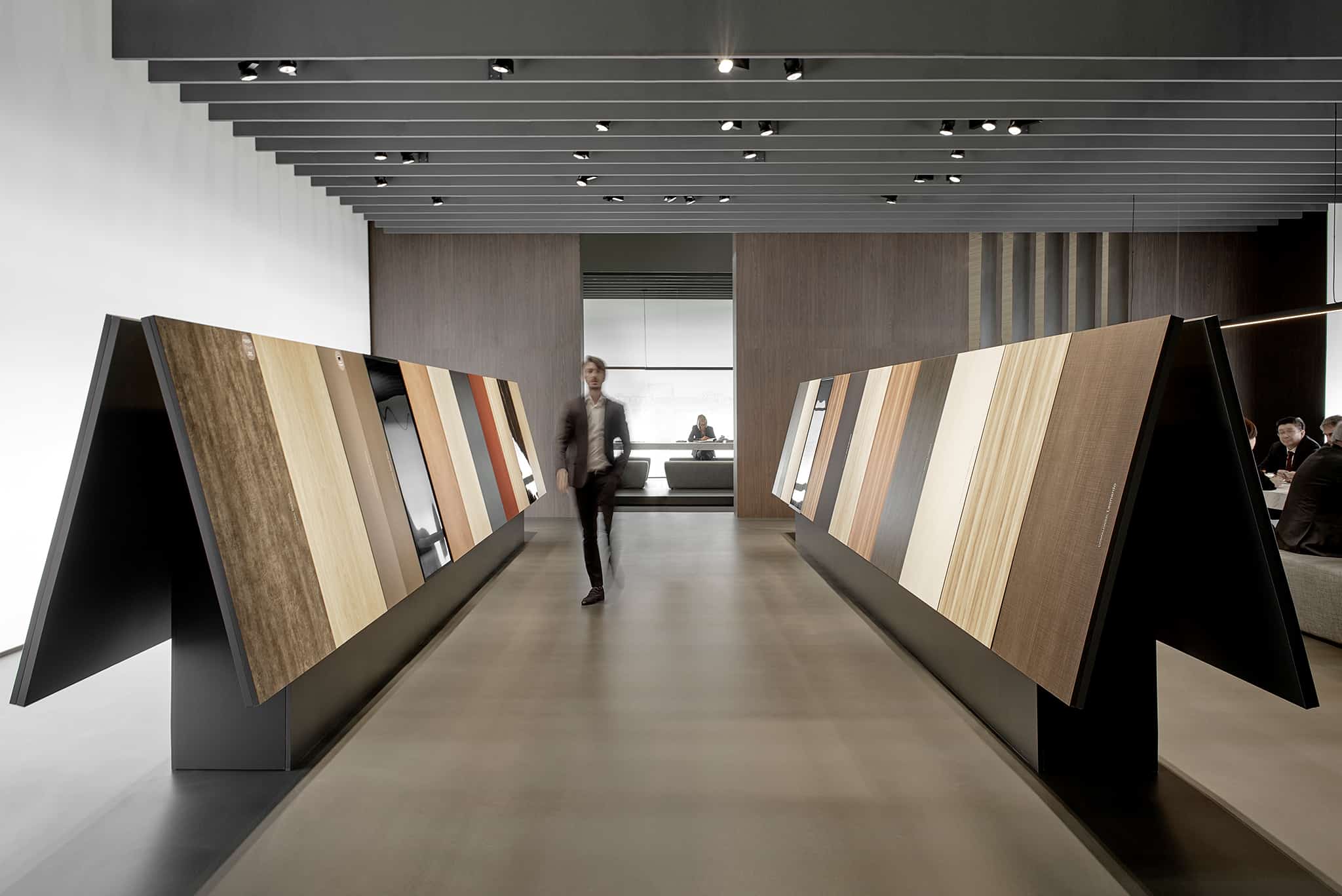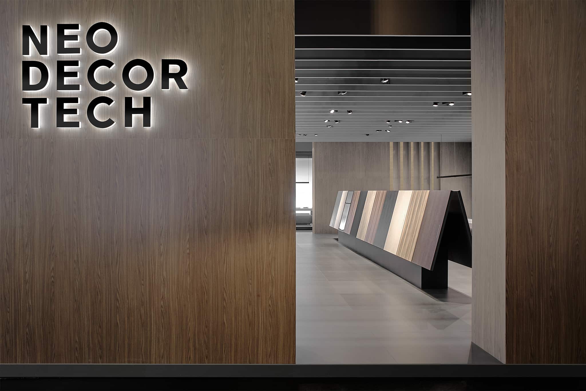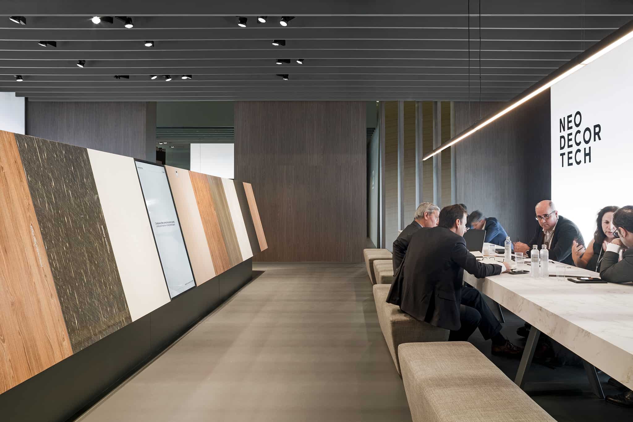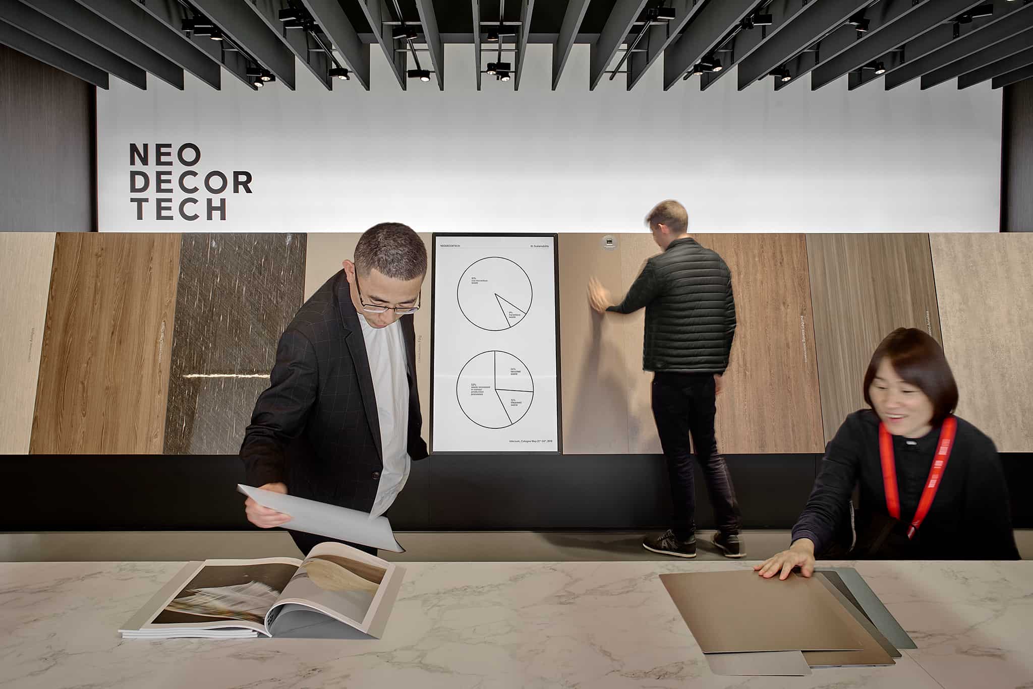 La collezione Neodecortech è protagonista dello spazio espositivo a Interzum 2019: all’interno di un’architettura rigorosa e monolitica, i campioni, selezionati tra i progetti più recenti, sono disposti in file precise come carte da gioco; li alternano approfondimenti video sul mondo Neodecortech, dai reportage sulla realtà produttiva alla rappresentazione infografica dei dati fondamentali della sua attività.