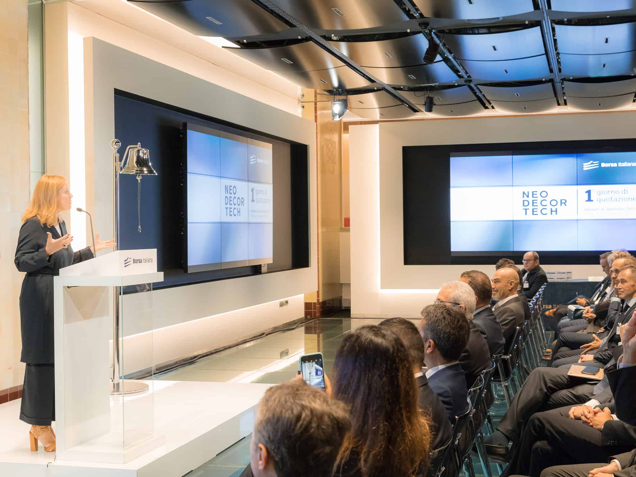 L’esordio ufficiale alla Borsa di Milano di Neodecortech, la società a cui fa riferimento Confalonieri, è avvenuto secondo la tipica cerimonia dell’occasione.