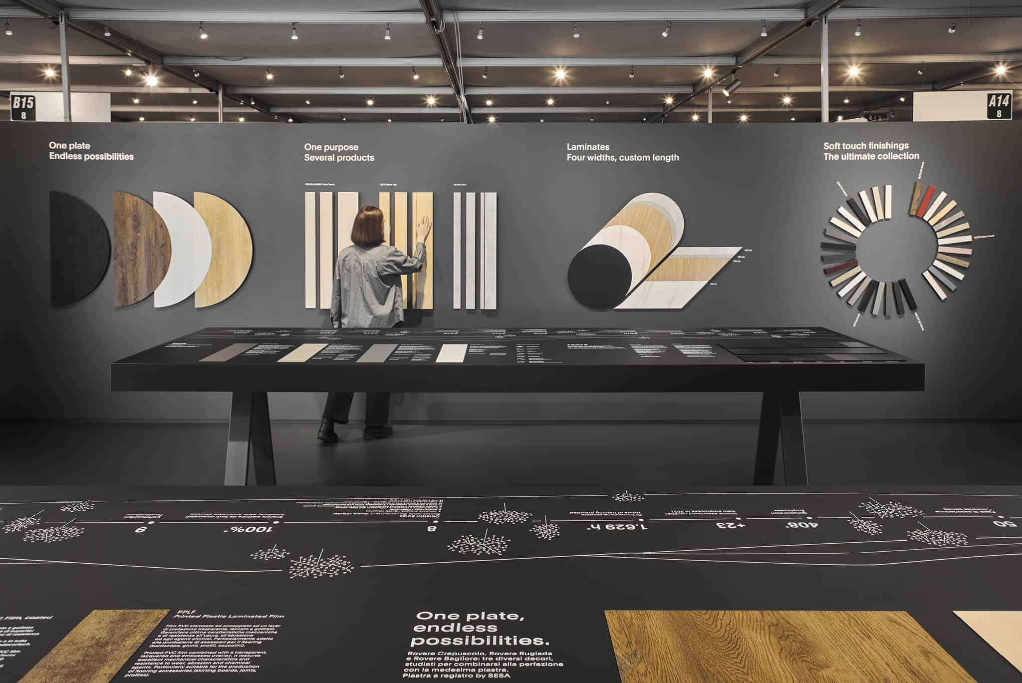 Una grafica dedicata ad ognuno di questi aspetti trova spazio sulla parete di fondo, mentre al centro dello spazio espositivo due grandi tavoli raccontano, in maniera puntuale, le famiglie di prodotti e l’impegno del gruppo sul fronte della sostenibilità.